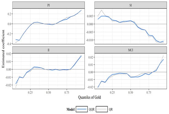 Estimation results based on QR model, where gold quantile is the response variable.