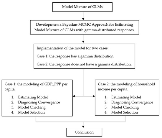 This paper is arranged in the following steps: in Section 2, the flowchart diagram of the research methodology is described. In Section 3, the Bayesian framework for inferencing the finite mixture of GLMs with gamma-distributed responses is provided with the required computation schemes for the MCMC method. In addition to describe the WAIC, we also present the Gelman-Rubin method, which is considered to be a suitable method for assessing the convergent condition of MCMC chains. The real data applications are presented in Section 4; Section 5 provides some discussions; and the main conclusions are given in Section 6.