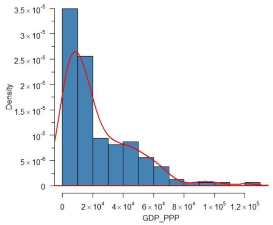 Data were obtained from World Development Indicators (WDI) of World Bank Open Data (2021) except for the CPI data, which were accessed from Transparency.org (2021). Before we apply our proposed model, we examine some data characteristics. Figure 2 shows the GDP_PPP per capita has a positive-skewed distribution which tends to follow a gamma distribution.