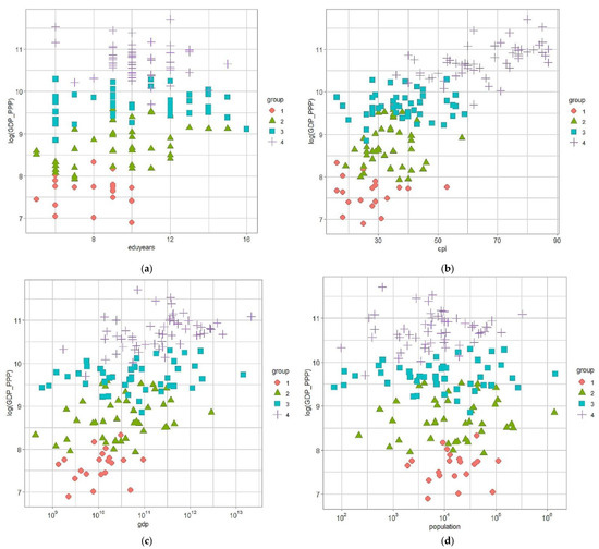 Therefore, we only assign the compulsory education years and the CPI as predictor variables in our proposed model, which has four mixture components representing the four economic groups. The model is defined by