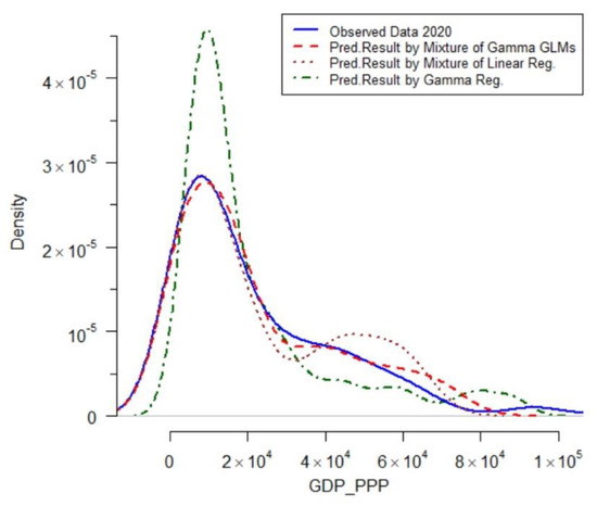 In the first case, we study the modeling of the gross domestic product at purchasing power parity (GDP_PPP) per capita in 160 countries. GDP_PPP per capita as the response for the overall data as well as in each mixture component has a gamma distribution with no extreme values.