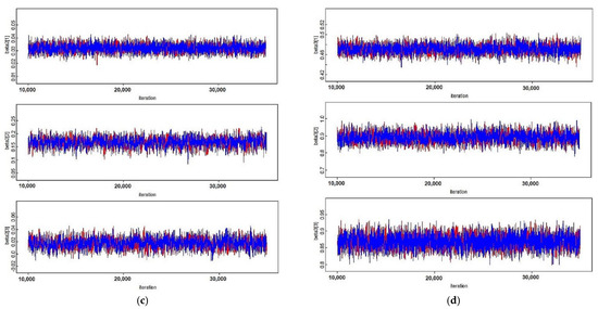 In the Bayesian schemes, the convergence of MCMC simulation implies that the Markov chain attains the posterior distribution of parameters. The MCMC convergence condition can be shown graphically by the trace plot of MCMC dynamical movements. The trace plot outlines the number of iterations against the generated values of estimated parameters. If these values, which are inside a domain, do not have firm periodicities or tendencies, then it can be supposed that convergence is reached. In a practical manner, the trace plot which virtually has a “fat hairy caterpillar” like plot indicates a convergence of the Markov chain (Tatarinova and Schumitzky 2015). Other analytical methods that can be implemented to assess the convergence of MCMC are fully explained by Cowles and Carlin (1996). One of the analytical methods, the Gelman Rubin method, is recommended to be implemented during the estimation of the Bayesian model through MCMC simulation (Gelman and Shirley 2011).