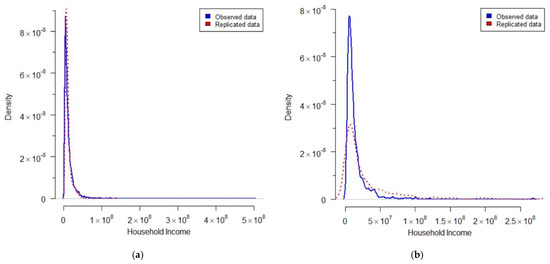 The second case, in addition to revealing the implementation of the model on the data that does not comply with the gamma distribution, exposes the influential presence of extreme values which can be regarded as outliers that can be eliminated from data or remain preserved in the data depending on their characteristics. Nevertheless, the existence of plentiful outliers in the data distribution was natural in the heavy-tailed distribution perspective (Klebanov and Volchenkova 2019). Hence, the outliers that exist in the household income data of the IFLS-5 do not need to be removed since they present an actual condition.