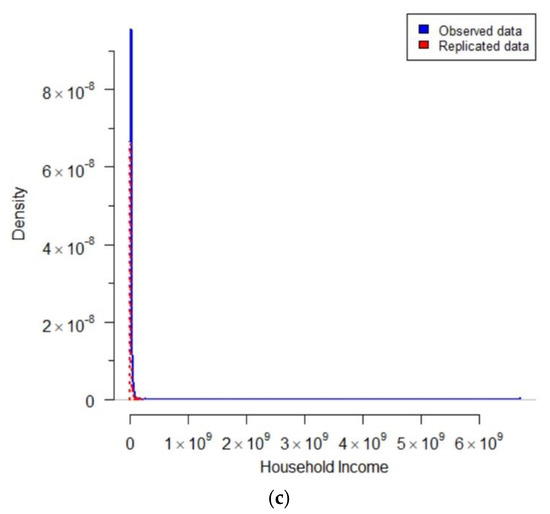 Conversely, in the second case, the household income data as the whole response are not identified as following a specific statistical distribution. Nevertheless, in each mixture component, the responses have different statistical distributions. In the first mixture component, the response has a generalized gamma distribution with four parameters, and in the other mixture components, the responses have lognormal distribution with three parameters. The data responses furthermore satisfy some essential properties such as being non-negative, continuous, positive-skewed, and the existence of linear relationships between the natural logarithm of the response and household characteristics as predictors. Such a case represented the implementation of the Bayesian mixture of the log-link gamma GLMs for modeling the responses that do not follow the gamma distribution but fulfil important characteristics that are needed to determine the model. Moreover, in this case, some extreme responses lay in each mixture component.