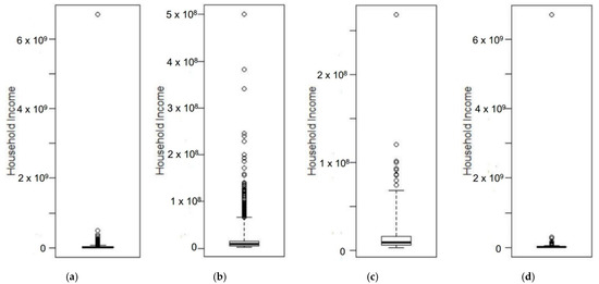 Referring to Equations (24)–(26), we find out that one of the possible sources in which the WAIC can have a large value is in the extreme values in the data distribution of that have a heavy-tailed distribution. Klebanov and Volchenkova (2019) showed that the observations belonging to the tail in a heavy-tailed distribution, i.e., extreme values, can have an infinite variance. To verify the existence of extreme values, we examine the adjusted boxplot, which is a modification of the boxplot used to depict a robust measure of skewness (Hubert and Vandervieren 2008). The adjusted boxplots displayed in Figure 11 describe some extreme values that exist in the household income data.