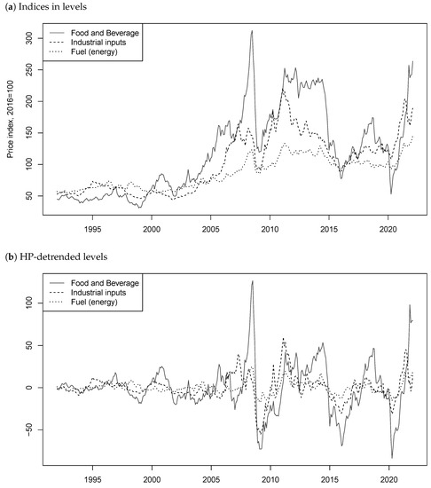 We illustrate our strategies in testing for common bubbles in mixed causal–noncausal processes on three commodity price indices: food and beverage, industrial inputs7 and fuel (energy)8. The sample of 362 data points ranges from January 1992 to January 2022.9 We can see from graphs (a) of Figure 1 and Figure 2, which respectively show the series in levels and logs, that the indices seem to follow similar trends. Long-lasting increases and crashes roughly occur at the same time. This could potentially suggest the presence of common bubbles between the series.