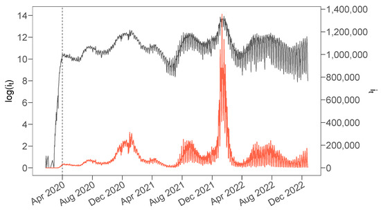 To analyze the state and dynamics of the COVID-19 pandemic, we consider data from the JH/CSSE, which can be downloaded from https://github.com/CSSEGISandData/COVID-19 (accessed on 14 March 2023). Figure 1 sketches the data on reported daily COVID-19 infections from the 22nd of January 2020 to the 25th of December 2022 for the U.S. in both levels and logarithms.
