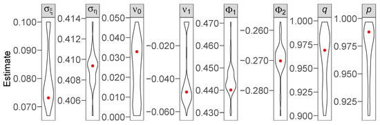 To ensure stable estimates of all parameters in and to avoid convergence to local optima, we employ an extensive three-step grid search that covers the relevant parameter space while remaining computationally feasible: In a first global grid search, 30,000 parameter combinations are randomly drawn from uniform distributions with sufficiently wide support to encompass the entire parameter space. To narrow down the locations of local and global optima, we pick the 50 -vectors corresponding to the greatest likelihood values. For each parameter, we store the minimum and maximum value of these 50 combinations, which gives us the range of the relevant parameter space. In the second step, these minimum and maximum values are employed as bounds to construct a finer parameter grid. After computing the likelihood of each grid point, we use the 50 grid points yielding the greatest likelihood as starting values for numerical optimization via the Nelder–Mead algorithm. The optimized parameters corresponding to the greatest log likelihood are then chosen as the final parameter estimate . Figure 2 outlines the parameter distributions as generated by these 50 optimization results.