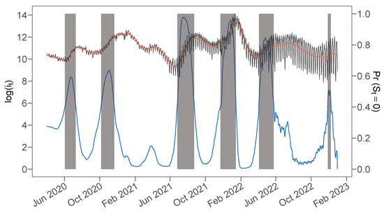 Smoothed trend estimates (orange, left scale), smoothed regime probabilities (blue, right scale), and log COVID-19 cases (gray, left scale). The smoothed trend is a probability-weighted average of the two regime-specific trend estimates. Infection waves (up-turning regime) as identified by are shaded.