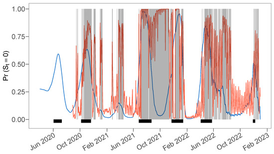 Smoothed regime probabilities (blue) and filtered regime probabilities (orange) for the up-turning regime. Days on which the filtered predictions exceed a threshold of are shaded. Horizontal black bars denote infection waves based on the smoothed estimates from Figure 3.