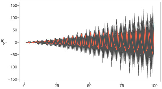 Similar to the traditional UC literature, is set to be a stochastic process with expected average equal to zero (see e.g., Durbin and Koopman 2012, ch. 3.2.2). However, contrary to the deterministic seasonality in (2), the stochastic specification (6) introduces nonstationary dynamics at lag seven. By plugging in and rearranging, (6) can be expressed as , and thus . Therefore, the unit root at lag seven links the current seasonal dynamics to those of the previous week, which generates a repeating seasonal pattern. In each period, a shock is added to , which yields an ever-increasing volatility over time. Figure 5 sketches 100 simulations of and illustrates the oscillating property and nonstationary nature of this seasonal component. Note that (6) differs from unit root seasonal components in the spirit of Harrison and Stevens (1976), which are rather to allow for time-variant seasonal dummies instead of generating an oscillating, diverging behavior.