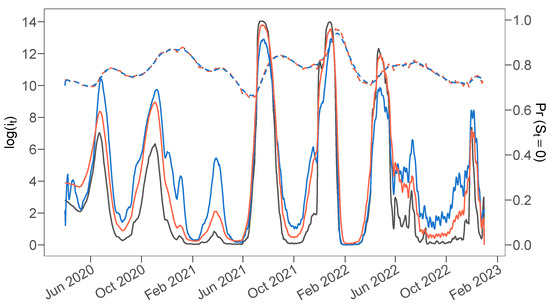 Executing the Kim filter and smoothing recursions yields estimates for the state vector. Figure 3 displays the smoothed trend and regime probabilities , together with the noisy measurement of log COVID-19 infections.