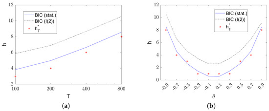 Figure 1 shows the resulting average lag lengths selected using BIC. The main effects contained in the theorem are clearly visible: the selected lag length increases with sample size. The logarithmic scale on the x-axis for plot (a) shows8 the roughly linear increase in . In addition, larger absolute values of result in larger lag lengths. The average selected lag lengths with BIC are very similar to the optimal values (corresponding to the stationary process ). The doubly integrated processes require roughly two more lags in all cases compared to the stationary process except close to (which is close to a pole zero cancellation), where only one additional lag results in the lag length selection on average.