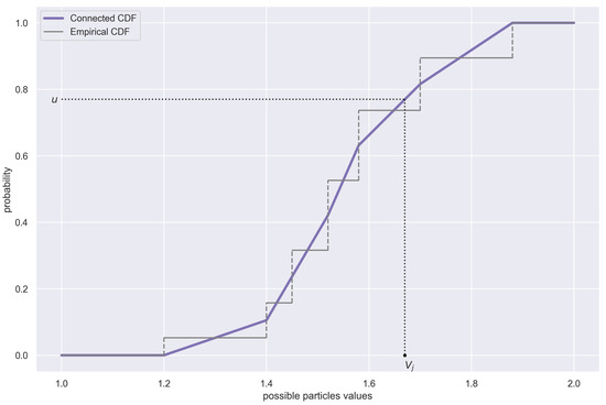 Visualisation of the process of resampling particles according to their probabilities. The values of the raw particles are the places, where the empirical cumulative distribution function (ECDF in short) jumps, and each jump size represents the probability of a respective raw particle. The connected CDF is a continuous modification of the ECDF, built according to Formula (72). In order to resample, a uniform random variable u is generated, and then its inverse through the connected CDF function becomes a new resampled particle, .