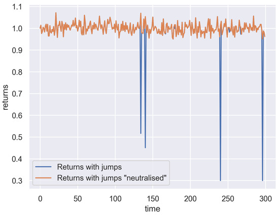 Parameter can be thought of as a “threshold” value—a proportion of the number of particles that encodes the occurrence of a jump to all the particles. If the number of jumps is expected to be significant, it is good to increase the value of , hence increasing the number of particles suggesting the jump in each step. The values of , which we observe to work reasonably well for most datasets, are between and . There is a multitude of ways in which one can assess a rational value of this parameter, and one of the most basic ones is visualising the returns of the asset in question and assessing the number of distinct downward spikes on the plot. The ratio of this number and the length of the sample should be a good indication of the region of the interval from which should be taken.