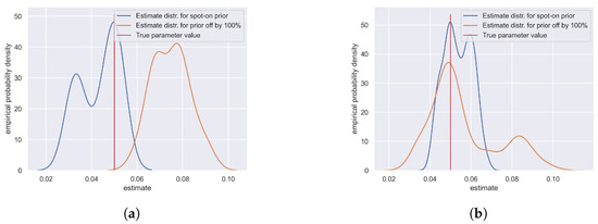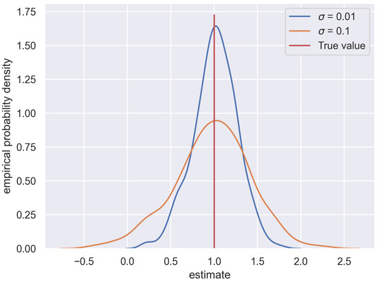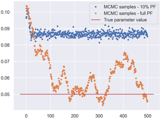It is worth noting that the realisation of appears in Equation (39); however, we have not defined it yet. This is because the distribution of is dependent on , and the distribution of is dependent on . Hence, we suggest taking the realisation of from the previous iteration here (which is indicated by the subscript). We address the order of performing calculations in more detail later in this article.