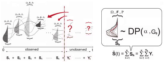 Figure 1 illustrates the unpredictable and heterogeneous nature of the aggregate losses and how this can be addressed by the Dirichlet process. A series of independent, identically distributed developed by for each policy h can be observed and collected within a certain policy period t. However, the presence of unsettled amounts of losses incurred from unknown policyholders or other unobservable features of the policyholders often increase the heterogeneity of each aggregate loss as well as the total aggregate losses . This is because any policyholders in different risk classes can raise claims at any time over a fixed time horizon t, and their unsettled claim amounts (i.e., random ) will not be known in advance. In order to understand the aggregate losses properly, one might need to answer questions such as “How much is ?” and “By which policy or risk class is incurred?”
