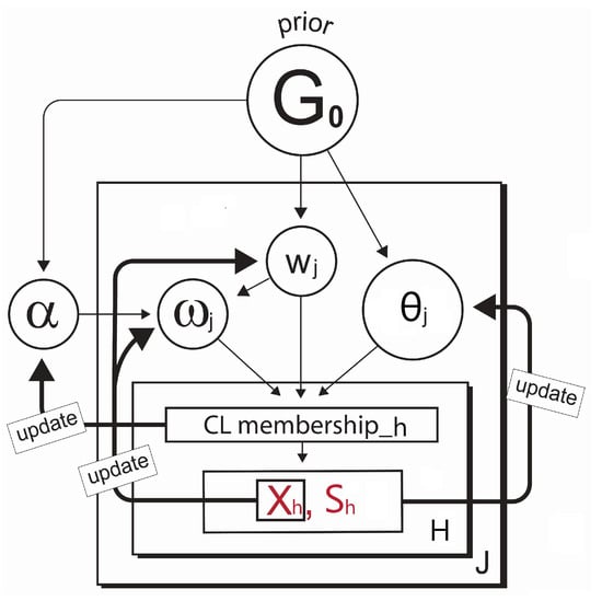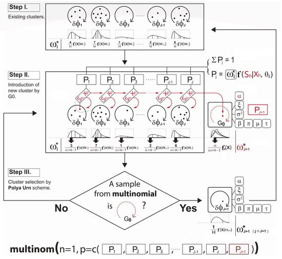 - Lastly, the new cluster membership is determined and updated by the Polya Urn scheme using a multinomial distribution based on the resulting cluster probabilities. This is briefly illustrated in Figure 2. Please note how the development of the cluster weighting components in Equations (6a) and (6b) is made in Figure 2.