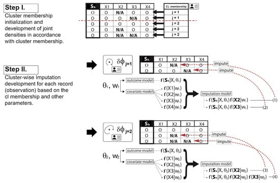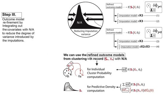 - Adding a reclustering step in the cluster membership update stage:To calculate each cluster probability after the parameter updates, the algorithm redefines the two main components: (1) the covariate model and (2) the outcome model. For the covariate model , we set this equal to the density functions of only those covariates with complete data for observation h. Assuming that , and the covariate is missing for observation h, then we drop and only use in the covariate model:This is the refined covariate model for the cluster j with the observation h, where the data in are not available. For the outcome model , the algorithm simply takes the imputation model in Equation (8) for the observation h and integrates it out of the covariates with missingness . This reduces the degrees of variance introduced by the imputations. In other words, as the covariate is missing for observation h, this missing covariate can be removed from the term that it is being conditioned on. Therefore, the refined outcome model isThe same process is performed for each observation with missing data and each combination of missing covariates. Hence, using Equations (9) and (10), the cluster probabilities and the predictive distribution can be obtained as illustrated in Step III in Figure 4.