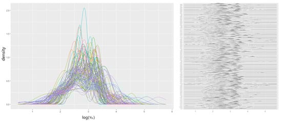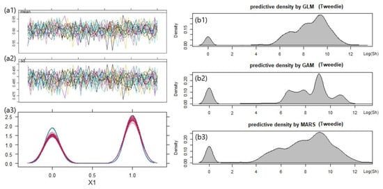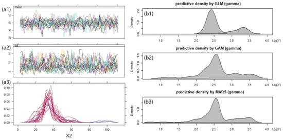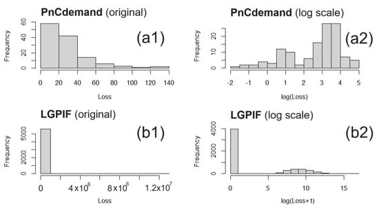 Histograms of the losses of the two datasets are exhibited in Figure 6. Due to the significant skewness, the loss data were log-transformed to attain Gaussianity. As shown in the histograms, each distribution displayed different characteristics in regard to skewness, modality, excess of zeros, etc. Note that the zero-inflated outcome variable in the LGPIF data (Figure 6(b1,b2)) required a two-part modeling technique that distinguished the probabilities of the outcome being zero and positive.