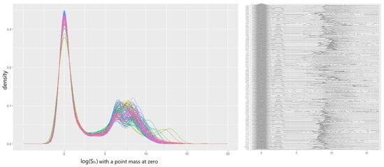 - Next, with the parameters sampled from the DPM prior described in Section 4.1 and the conditional probability term on lines 6 and 9 in Algorithm A2 for the observation assignment, the ultimate probabilities of the selected observation h being in the current discrete clusters and the proposed continuous cluster are computed, respectively. (The use of such a nonparametric prior to the development of a new continuous cluster allows the shape of the cluster to be driven by the data). Note that the term is known as the Chinese Restaurant process (see ) probability given bywhere c is a scaling constant to ensure that the probabilities add up to one and is the collection of cluster indices assigned to every observation without the cluster index of the observation h. A larger results in a higher chance of developing the new continuous cluster and adding to the collection of the existing discrete clusters. Since the number of clusters is not fixed, and the sequence of cluster assignment to observation cannot be ordered, one might be concerned about the sampling variance or convergence problem in the Gibbs sampler. In this regard, we expect that Equation (7) can carry out stable simulations with the Gibbs sampler. () pointed out that from the example of Escobar’s algorithm, the sequence in which the observation h arrives in the cluster is exchangeable under this conditional probability distribution described in Equation (7). This means that the ultimate joint distribution to update the cluster memberships from lines 4 to 10 in Algorithm A2 does not depend on the order of the sequence in which the observations arrive.