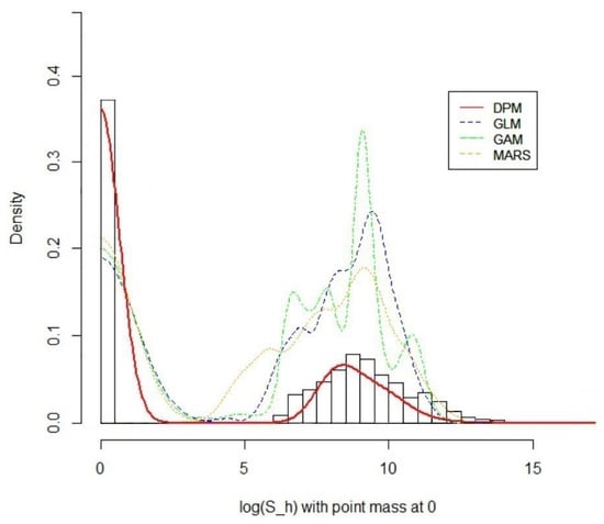 () presented several existing methods for the log-normal sum approximation that have been studied in the literature. This includes the moment-matching approximation approaches such as minimax approximation, least squares approximation, log-shifted gamma approximation, and log skew-normal approximation. The distance minimization approaches—minimax approximation or least squares approximation—described by (); () are conceptually simple, but they require fitting the entire cumulative densities to the sum of the claim amounts, which can be computationally expensive and fail easily when the number of summands increases. The log-shifted gamma approximation suggested by () has less strict distributional assumptions, but it is not particularly accurate at the lower region of the distribution. In our study, special attention is paid to the possibility of the log skew-normal approximation method for the sake of simplicity. A skew-normal distribution as an extension of a normal distribution has a third parameter to naturally explain skewness apart from the other parameters (for a location and spread). () pointed out that one can exploit the third parameter of the skew-normal distribution to capture different skewness levels of each summand. By taking the log of the skew-normal densities, we can approximate , the sum of the log-normal . Using the log skew-normal as the underlying distribution for in the DPM framework, one can eliminate the need to compute the cumulative density curve, and its closed-form density and the optimal distribution parameters for can be easily obtained by the moment-matching technique. For further details, see () and the references contained within.