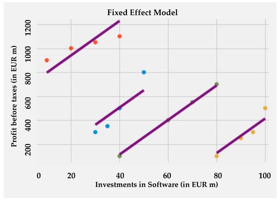 These time-fixed confounding variables are entity-specific characteristics. Location and industry are immeasurable in terms of their influence, but the company that possesses them remains the same over time. Under the assumption of parallelism (i.e., that the effect of investments in software is identical across firms), dummy variables are now created for each firm and added to a linear model. When estimating the impact of software investments on firm performance, regression determines the impact of software investments while leaving the firm variable unchanged. This is known as a fixed-effect model (see Figure 2).