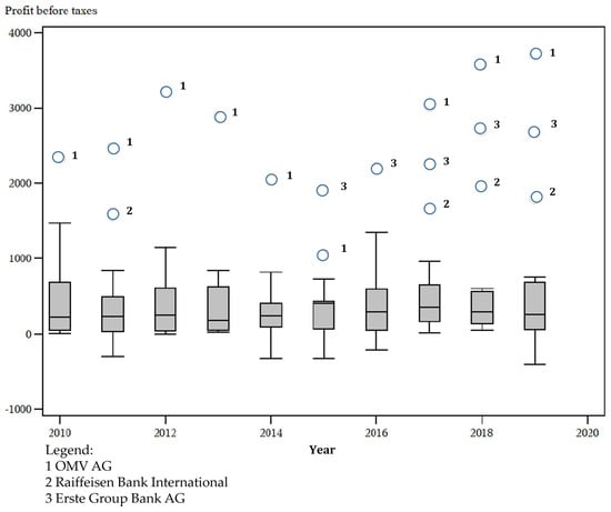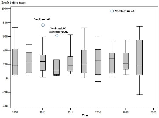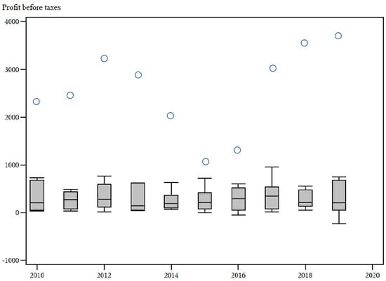 Median, minimum, and maximum as well as upper and lower quartiles of profit before taxes for each company from 2010 to 2019 (in millions of EUR; n = 19).