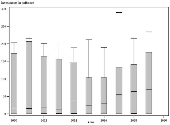 The analysis of investments in software reveals notable differences in the median between the various companies. Considering the median over the years for all companies, the highest value was in 2014 (EUR 29.6 million), and the lowest was in 2010 (EUR 5 million).
