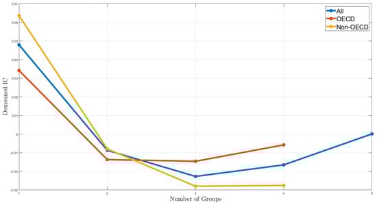 where is the maximum number of groups, as determined by empirical research. Due to the data requirement, we set for the full sample, covering all countries, while for the subsamples, is applied separately to OECD and non-OECD countries. Figure 4 shows the de-meaned IC values for different numbers of groups, revealing that the IC curves reach their lowest point at for all sample selections.6 Therefore, we select three as the optimal number of groups for our subsequent analysis.