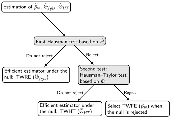 In empirical applications, the two tests should be used successively, as shown in Figure 1. After calculating the TWFE ( β ˜ w ), TWRE ( Θ ^ f g l s ) and TWHT ( Θ ^ H T ) estimators, the first test is the Hausman test defined by H ^ = q ^ v a r ( β ˜ w ) v a r ( β ^ f g l s ) 1 q ^ , where q ^ = β ^ f g l s β ˜ w , and β ^ f g l s is a subset of Θ ^ f g l s . Under H 0 (none of the individual effects or time effects are correlated with the regressors), H ^ χ k 2 , and one chooses the efficient estimator TWRE. If this test is rejected, we use the over-identification test (called the Hausman–Taylor test in Figure 1) obtained by computing m ^ = q ^ v a r ( β ˜ w ) v a r ( β ^ H T ) q ^ , where q ^ = β ^ H T β ˜ w , with β ^ H T representing a subset of Θ ^ H T , and ⊖ is the symbol of the generalized inverse. Under H 0 , m ^ χ l 2 with l = 2 k 1 g 2 h 2 , and the efficient estimator TWHT is chosen. If the second test is rejected, the TWFE estimator is selected.