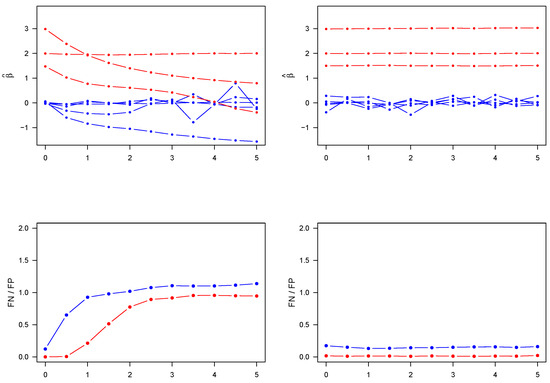 Estimation and selection results for Example 2 with . In the upper panel, the estimated non-zero parameters are marked red, while the estimated zero parameters are marked blue. In the lower panel, FN is marked red and FP is marked blue.