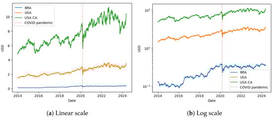The “Close” price column was used for this analysis, and the time range was restricted from January 2014 to June 2024. The currency used in the time series was USD, as well as BRL for the Brazilian companies. A conversion was performed according to the quotation of June 2024. The stock-price time series for companies operating in California was also aggregated to evaluate the volatility of the energy stock prices compared to the state’s energy cost.
