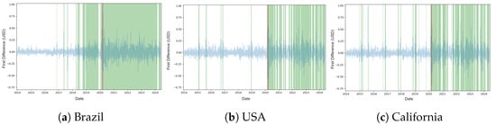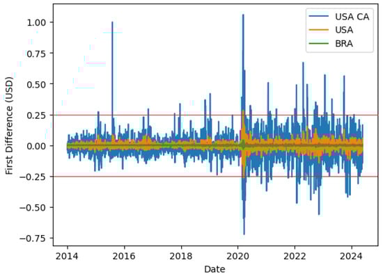 The symmetrical distribution of the values in the time series, as observed in Section 4.3, may indicate that positive and negative price movements are equally likely, reflecting balanced market sentiment and reactions to information. This is also a desirable feature in volatility modeling with GARCH, as shown in Section 4.4, where a greater volatility was predicted in the Brazilian market when compared to the US and California.