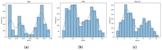 To appropriately select the volatility model in this work, we evaluated the symmetry of the distribution of the time series of stock prices for energy companies operating in Brazil, the USA, and California, as shown in Figure 4.