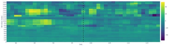 Figure 6 illustrates the cross-correlation heatmap between the normalized and aggregated energy stock-price time series (differentiated once) and the normalized energy price. The maximum cross-correlation values were found between 83 to 90 and 98 to 102 lags, as visualized in Figure 6, suggesting that changes in the energy stock prices preceded similar changes in the energy prices over a daily interval period. This relationship indicates a predictive lag where fluctuations in the stock market prices of energy companies can forecast subsequent changes in the energy prices within this period.