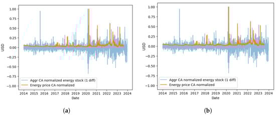 Comparison of the normalized energy stock price and left shifted energy price. (a) The normalized and aggregated energy stock price time-series when differentiated once and the normalized energy price when left-shifted at 88 days. (b) The normalized and aggregated energy stock price time-series when differentiated once and the normalized energy price when left-shifted at 100 days.