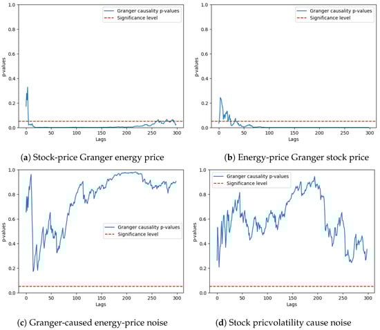 To serve as a baseline, the test was replicated with a noisy stationary time series of the null mean and standard deviation that were equal to 1. Figure 9c,d evidence that neither time series presented a Granger causality with this noise, as displayed by the p-values being consistently above the significance value. This reinforces the relationship between the energy stock market and the energy prices in California.