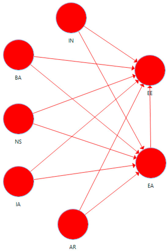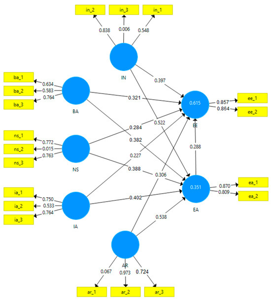 Figure 3 shows that all the values of the reflective variables used in the model exceed 0.5, indicating that all coefficients are statistically significant, thereby confirming the validity of the measurement model. The predictive value of the structural model was first assessed in terms of the coefficients of determination (R2), and the obtained values can be seen in Figure 3. Hence, IN, BA, NSs, IA, and ARs can explain (together) 48.4% of the variation in EA (R2 = 0.484) and 71.2% of that in EEs (R2 = 0.712).