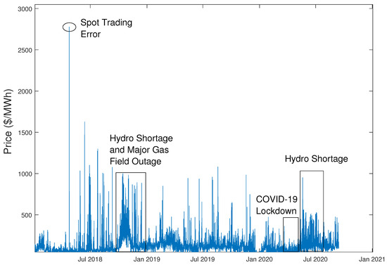Our electricity price dataset consists of half-hourly electricity prices from the Otahuhu node in New Zealand from 1 January 2018, to 30 September 2020. The New Zealand electricity market is a real-time market, where electricity prices are determined by matching demand and supply every five minutes. The prices are determined as the highest bids made by electricity generators capable of clearing all demand. However, the five-minute prices are not accessible and are averaged to produce the half-hourly prices, which are made publicly available for analysis.