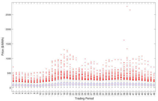 Figure 3 displays a box plot of half-hourly electricity prices for our sample period. The bottom and top edges of the box represents the 25th and 75th percentiles of data, while the red line inside the box represents the median price. The red crosses outside the box represents any outliers. Electricity prices exhibit a large quantity of outliers in the form of spikes that are observed in Figure 1. Furthermore, the size and intensity of the outliers are increased during peak price hours. As a result, the peak hours forecasts will have a higher priority than off-peak forecasts.