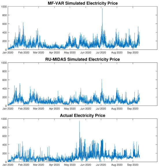 Figure 5 displays the actual electricity price along with simulations generated from the MF-VAR and RU-MIDAS-VAR models. When running multiple simulations, we found that some spikes persistently appear in specific periods in our forecast horizon, suggesting that the weather variables have some impact on price spiking. However, we notice, in several periods, a large mismatch between simulated prices and actual prices. As we expected, there is a vast amount of information in the price data that cannot be explained by weather variables alone. The VAR framework with weather data is capable of capturing key characteristics, however, more data on market dynamics as well as macroeconomic variables, such as commodity prices, may improve our forecasts. Furthermore, we may be able to improve the simulated price density using heavy-tailed distribution within the VAR framework.