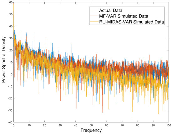 To study the capability of our forecasting models to replicate the mean-reversion and seasonality characteristics of electricity prices, we observe the half-life, and spectral density plots, respectively. The half-life values are derived from the lag 1 autocorrelation coefficient, and they denote the decaying rate of deviations from the long-term mean. Similar half-life values between different time-series’ indicate similar mean-reversion characteristics. Table 3 displays the AR(1) coefficient and corresponding half-life values for the actual prices and prices simulated from the MF-VAR and RU-MIDAS-VAR models with OLS estimates. The half-life is approximately 0.7 for all three time-series, indicating similar mean-reversion rates. The spectral density will show the distribution of variance for each frequency component in the time series. Peaks in the spectral density correspond to dominant frequencies, which are related to seasonality. Visualizing the spectral density plots and observing the correlation of the spectral densities between actual and simulated prices can help us identify the captured seasonality of the models. This visualization is provided in Figure 6. In this figure, we observe the logarithm of power spectral density to improve interpretability. We notice that the spectral density plots of actual and simulated prices are similar, indicating that the models are able to capture the seasonality of electricity prices. Furthermore, the correlation between the spectral densities of actual prices and the MF-VAR simulated price is 0.999, and the correlation between the spectral densities of actual prices and the RU-MIDAS-VAR simulated price is 0.997.