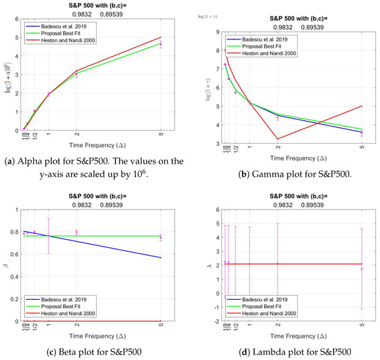 These tables and figures, together with similar analyses carried out for Dow Jones and NASDAQ in Appendix A, reveal various important and clear features in terms of time-scale parameterization, which are all compatible with our proposed parameterization in Equation (19). These are: