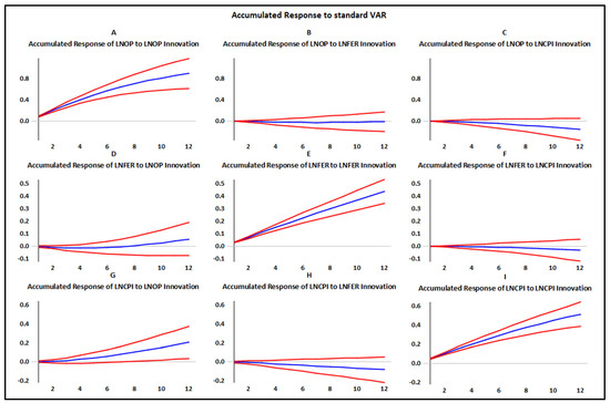 | Portmanteau Test for autocorrelations | No residual autocorrelations | VAR | 60.10 | 0.26 | Null hypothesis accepted |