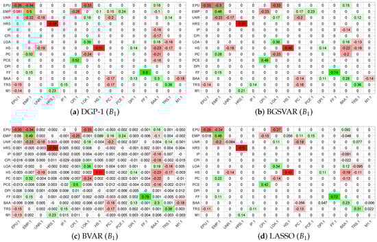 Before analyzing the impulse response performance of the competing methods, we first compared the VAR slope coefficient matrix for DGP-1 with the estimates from BGSVAR, BVAR, and LASSO. Figure 1 presents these comparisons, with response variables listed along the rows and explanatory variables along the columns. The coefficients are colour-coded: red represents negative values, green indicates positive values, and white denotes zero (or near-zero) coefficients.
