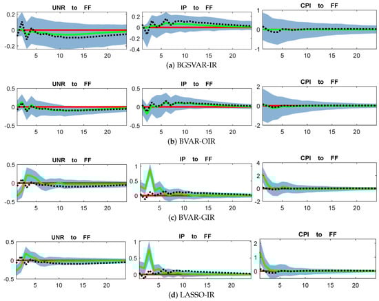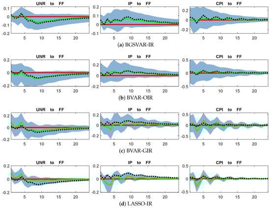 The response of the UNR, IP, and CPI to FF based on 1000 trials from DGP−1: Sparse ()−Sparse (). The x-axis represents the time horizon (lags after the shock), and the y-axis shows the response magnitude of the variable. The black dashed lines represent the true DGP IRs, the green solid lines represent the median IR estimates, and the shaded areas represent the 95% confidence bands. The red line marks the zero level.