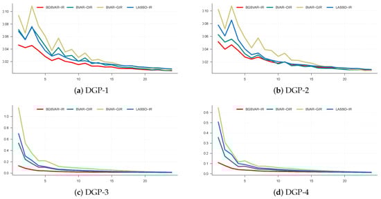 We simulated a VAR(3) process with 396 observations and estimated all competing models using the true lag length. Impulse response (IR) coefficients were computed for 24 forecast horizons (). To ensure robustness, we replicated the simulation 1000 times using Monte Carlo simulations with random draws from the DGP.