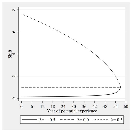 The studied effects correspond to education (Table 3) and experience (Table 4) in order to simulate different interventions and their potential effects on measures of inequality. We consider the estimators of the location, scale, and asymmetric effects discussed above for the Gini, Theil, and Atkinson indices (see the Appendix A for more details on each index). All index values are multiplied by 100, and all effects correspond to a change in education/experience on the corresponding shift. Figure 1 and Figure 2 show the modeled shift for each year of education/experience depending on the value chosen for .