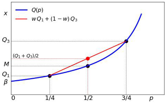 In Figure 2, we take p 1 = 1 / 4 , p 2 = 3 / 4 , and w = 1 / 2 . The convexity of Q ( p ) implies that M < ( Q 1 + Q 3 ) / 2 . We may consider other choices for p 1 , p 2 , and w and obtain the following inequalities that will be useful later in this paper: